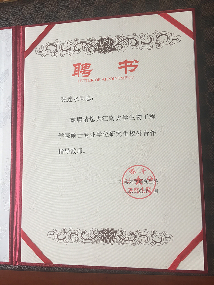 江南大學(xué)生物工程學(xué)院,吸納一定數(shù)量的各領(lǐng)域高精尖專業(yè)技術(shù)人員兼任專業(yè)學(xué)位研究生導(dǎo)師,是培養(yǎng)高層次應(yīng)用型人才的需要,在聘任人員遴選上有嚴(yán)格的選聘原則、條件和審核程序。聘張連水總經(jīng)理為江南大學(xué)生物工程學(xué)院碩士專業(yè)學(xué)位研究生校外合作指導(dǎo)教師,參與學(xué)校研究生培養(yǎng)和學(xué)科建設(shè),指導(dǎo)碩士研究生進(jìn)行應(yīng)用研究,有助于增強(qiáng)學(xué)??蒲袆?chuàng)新力和轉(zhuǎn)化力,對培養(yǎng)實踐與學(xué)術(shù)并重的專業(yè)學(xué)位研究生具有重要意義。